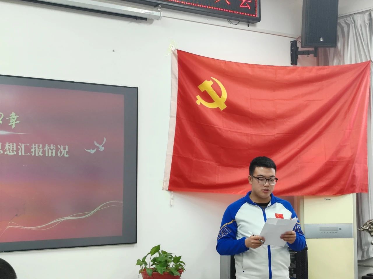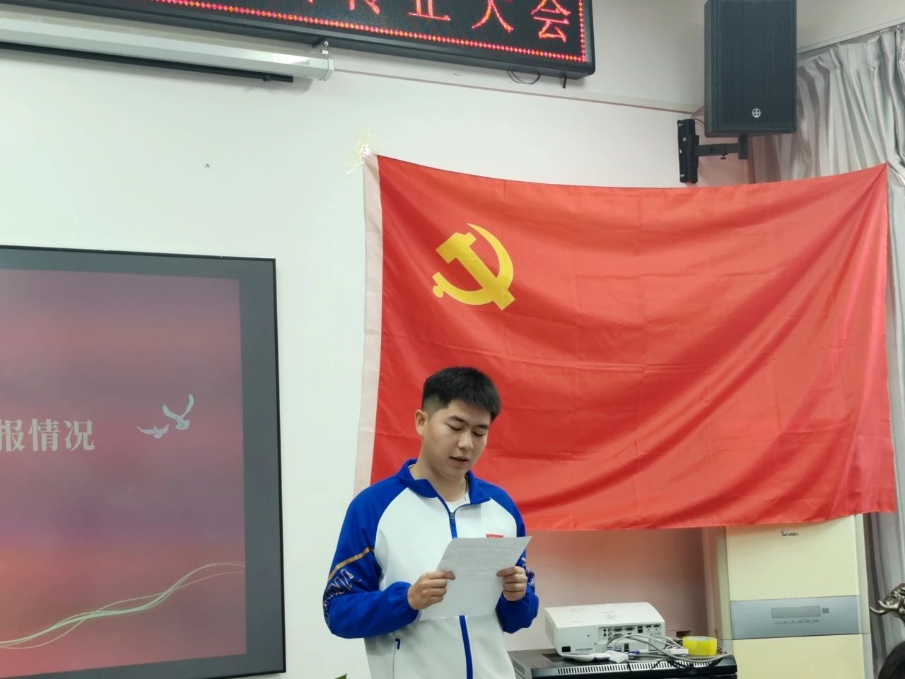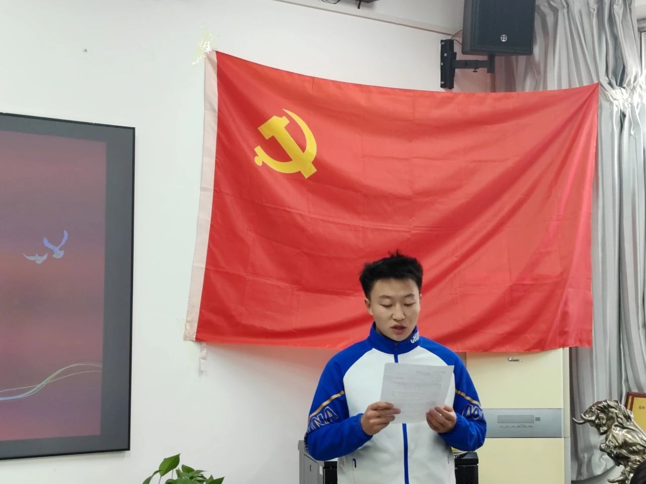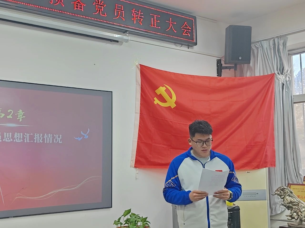 会议开始,全体起立,面向党旗奏唱《中华人民共和国国歌》,在庄严肃穆的歌声中,转正大会拉开帷幕。
