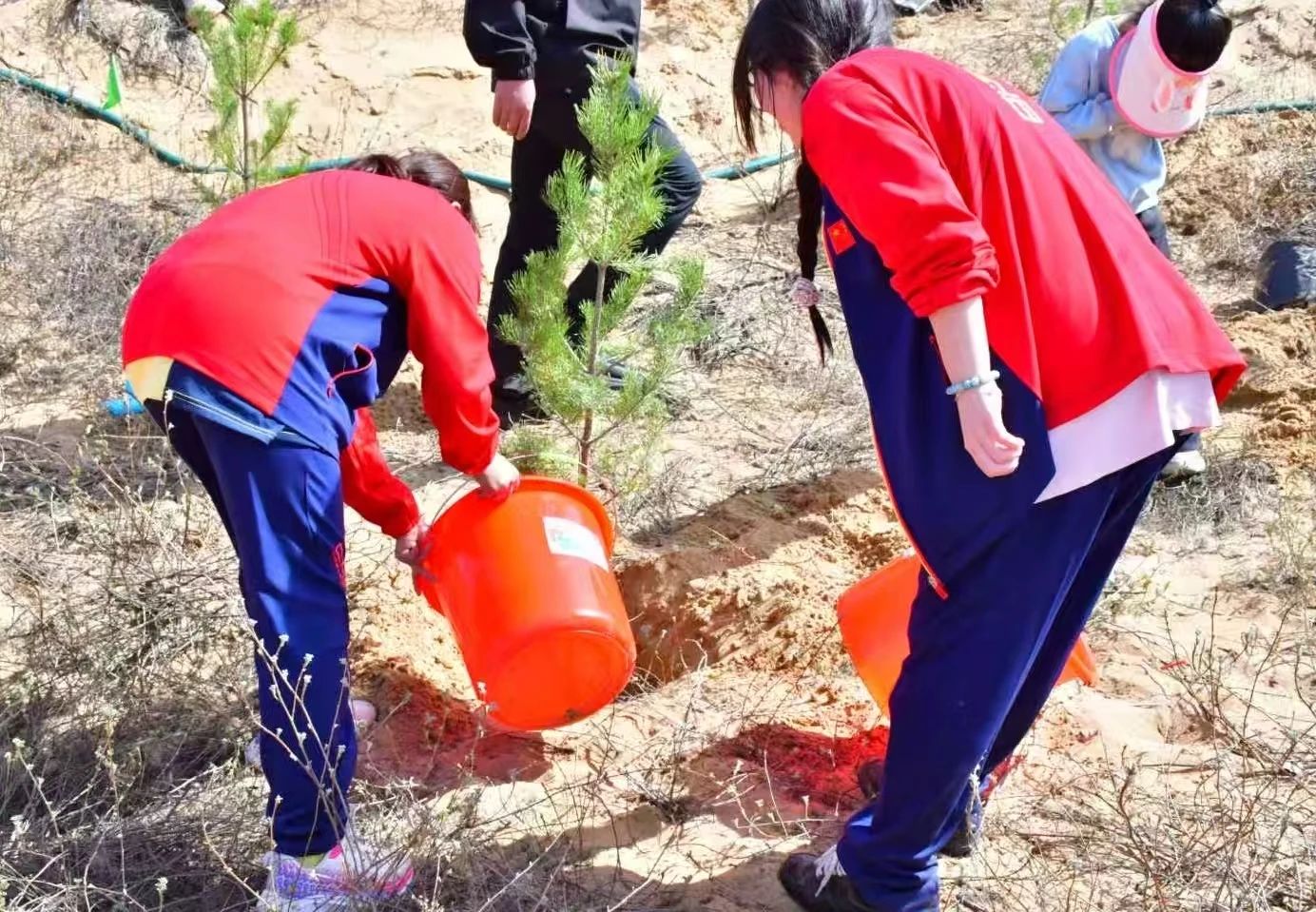 尽管挖土时尘土沾衣、浇水时泥水溅身,却丝毫没有削减同学们的热情。大家相互鼓励、比拼速度,欢声笑语回荡在植树场地,青春的热血与干劲儿,在每一次弯腰、每一次挥锹中尽情释放。